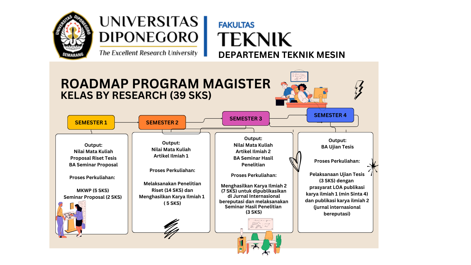 Sedangkan program by reasearch, diperuntukkan bagi mahasiswa yang ingin memperoleh gelar Magister Teknik melalui jalur penelitian yang pelaksanaannya dapat dilakukan di kampus Undip maupun di lembaga penelitian lainnya atau dapat juga dilaksanakan di Industri terkait. Persyaratan publikasi untuk dapat menyelesaikan program by reasearch adalah 2 publikasi karya ilmiah dimana salah satunya wajib dipublikasikan di Jurnal Internasional bereputasi (terindeks SCOPUS).