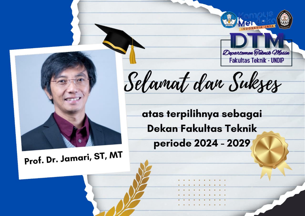 Rektor Univesitas Diponegoro Prof. Dr. Yos Johan Utama, S.H., M.Hum. secara resmi telah melantik salah satu dosen Departemen Teknik Mesin Prof. Dr. Jamari, S.T., M.T. mejadi Dekan Fakultas Teknik Undip periode 2024-2029 pada tanggal 15 Januari 2024 pukul 10.00 WIB di Gedung Prof. Sudarto, S.H., Kampus Undip Tembalang. Dalam kegiatan ini juga turut dihadiri oleh Keta Senat Akademik, Wakil Ketua Majelis Wali Amanat, Wakil Rektor, Dekan Fakultas/Sekolah, tamu undangan, dan pejabat Undip yang dilantik.